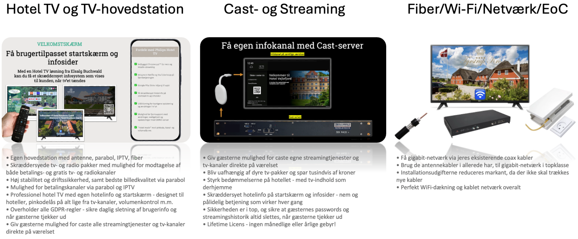 Skal du bygge, renovere eller opgradere jeres tekniske udstyr, så er vi er specialister og kan tilbyde en samlet professionel løsning med tv- og radiokanaler, parabol- og antenneanlæg, cast- og streaming, IPTV, fiber, Wi-Fi/Netværk/EoC (Ethernet Over Coax) og AV-udstyr.